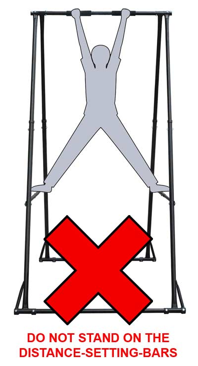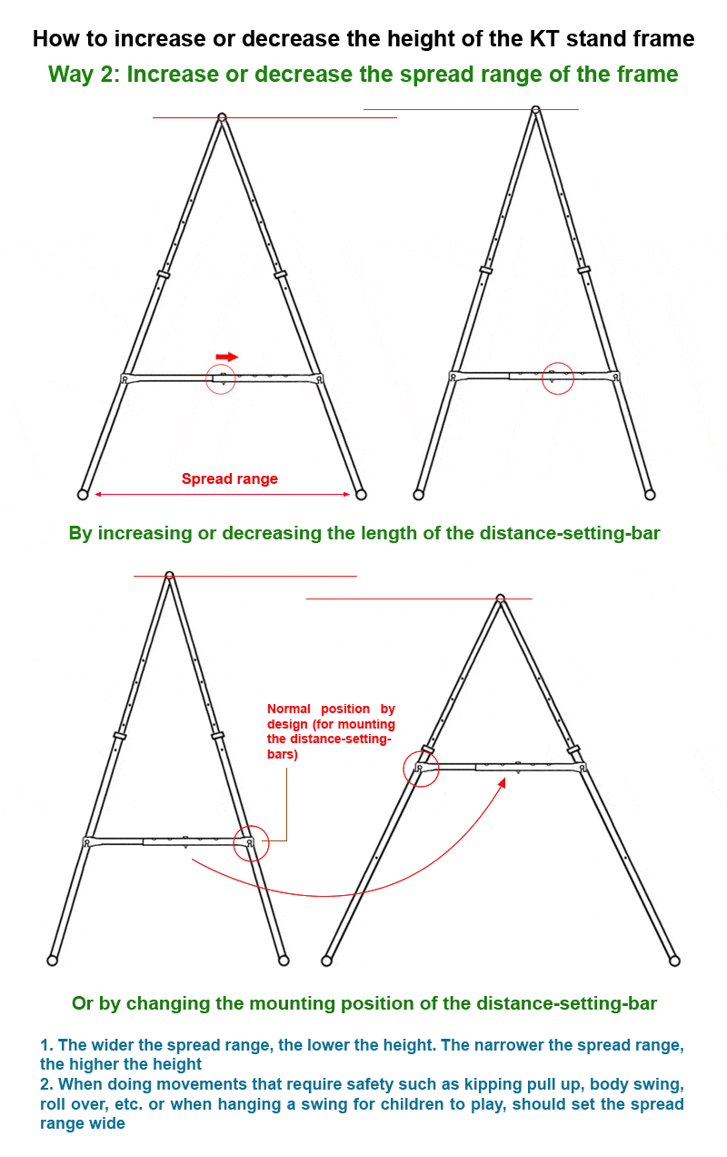 Aerial yoga、body swings、kipping pull-ups、muscle ups、turn oversなどの安全を必要とする運動を行う場合、KTの折りたたみ懸垂バーの足元(広がり範囲)をできるだけ広げてください。