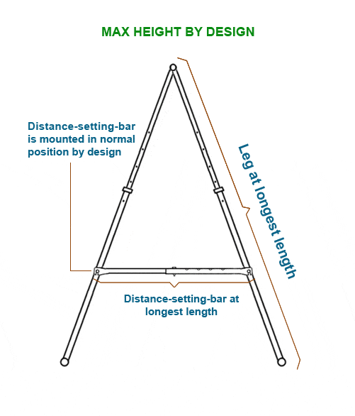 「設計上の最大高さ」は、4本の脚を最長に設定し、2つのdistance-setting-barを最長に調節し、それらのバーを設計上の通常の位置に取り付けるときのKTスタンドフレームの高さを指します。