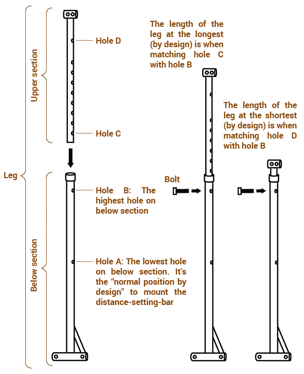 各脚は2つのセクションで構成されており、外径が小さい上部セクションと外径が大きい下部セクションがあります。アンテナのように動作します。フレームの高さを変更するために各脚の長さを調整するには、上部セクションの穴の1つを下部セクションの穴と合わせ、ボルトを通します