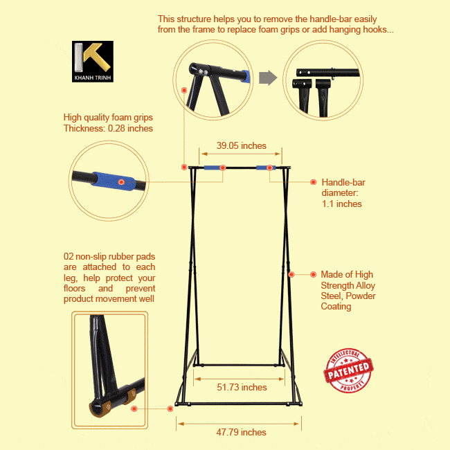 Khanh Trinh氏が設計し、15年間のCalisthenics & Street workoutの経験を持っています。KT懸垂バー KT1.1520は、自宅でのCalisthenicsとStreet workoutのための優れた携帯式pull-up barとなります。High Quality Pull UpsとChin Upsのエクササイズを提供します。足の先は地面に触れず、全身のスイングとストレッチが可能です。動きに制限はありません。Kipping pull-ups、weighted pull ups、back lever、front lever、hanging crunch、rings exercises、knee raise、leg raiseなどが上手くできます
