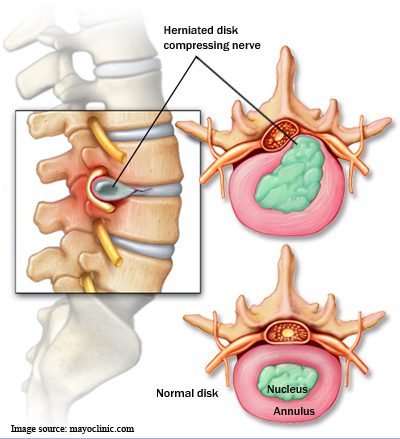 a) Herniated disc: Spine is composed of many vertebrae stacked. Between the vertebrae are discs – round shape and flat as a plate – which functions as a shock absorber for the spine and helps the spine become more flexible, enables easy bending. The disc is made up of a thick and solid outer fibre shell (outer ring of the disc), and a gel inside (almost like egg whites) called mucus (the central softer portion). When the disc is injured (usually by the excessive pressure from the two vertebrae), the outer layers of fibre shell break or tear, allowing some of the gel to leak out, forming a mass called a herniated mass. The herniated mass will press to the nerve roots causing extreme back pain for patients. This is the main cause of “sciatica” – the pain from the low back and buttock down the leg